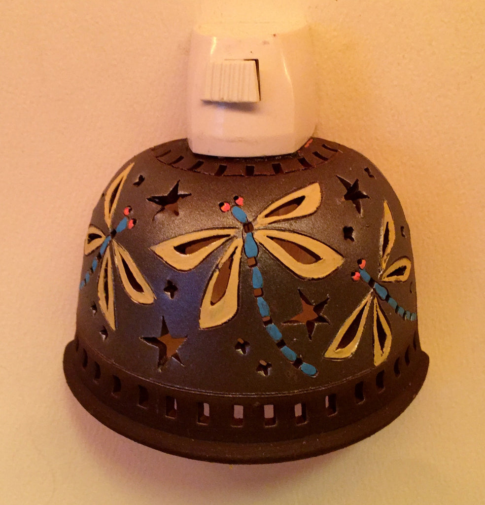 Three open winged dragonflies float on a metallic finished nightlight. (This is a copy of the nightlight I use in my bathroom....looks great with the granite countertop)