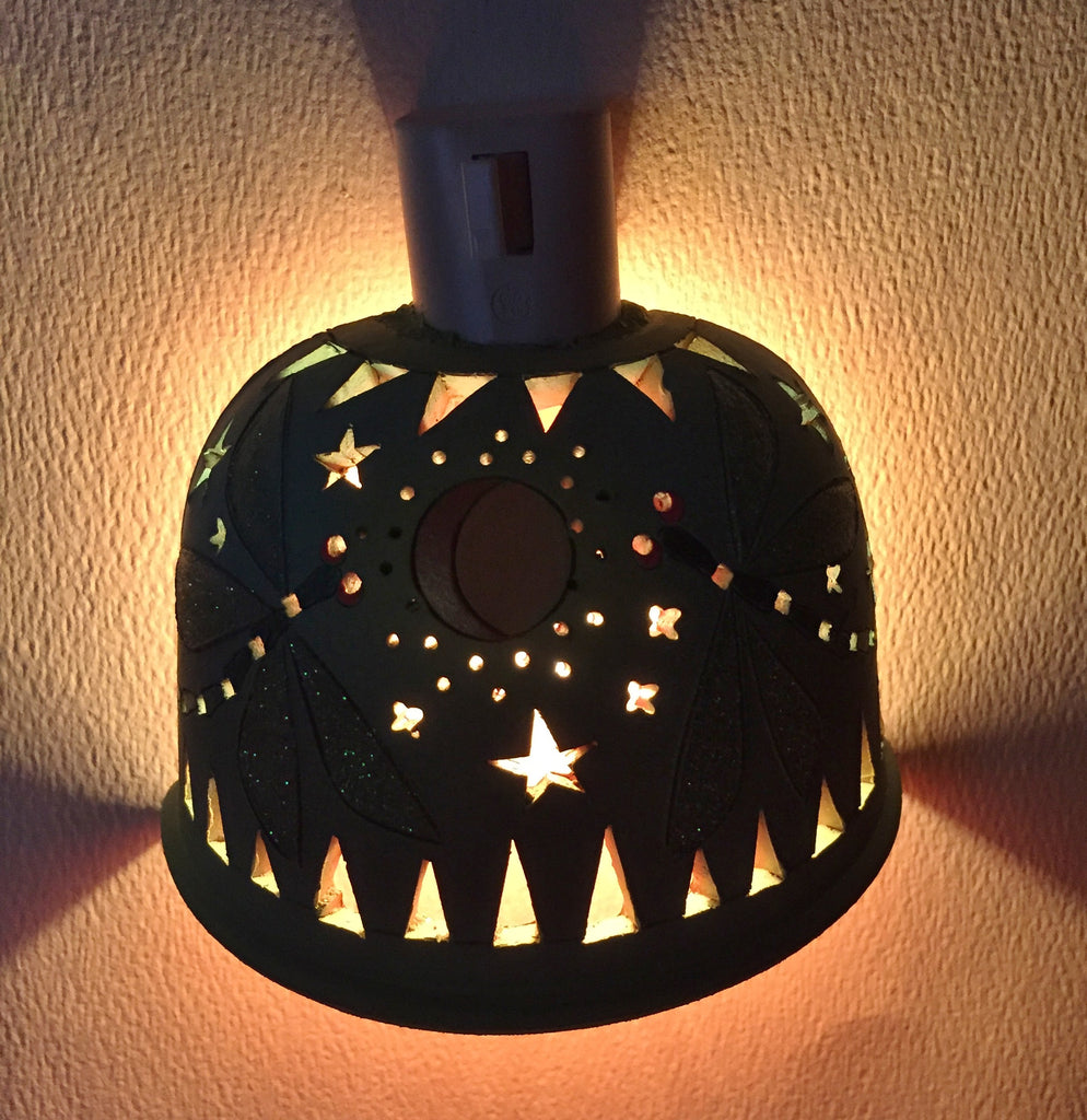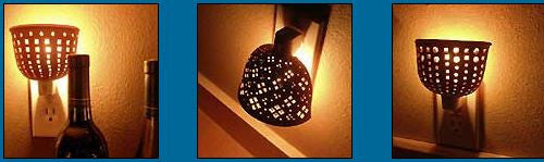 These half round night lights are made of terra cotta clay. Each one is designed to show interesting light patterns when they are lit. They are set away from the outlet. Unless the outlet is in a corner, they generally do not cast light patterns on the wall. They will wash the wall behind the fixture with light, and provide fair amount of light in a dark room.
