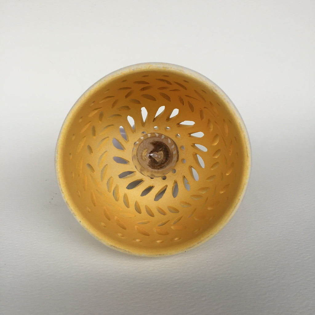 This hand made night light is formed of white earthenware clay at starrylights studio. It is hand drawn and carved while the clay is wet, then fired and painted. The exterior is white, and the interior is shaded yellow.