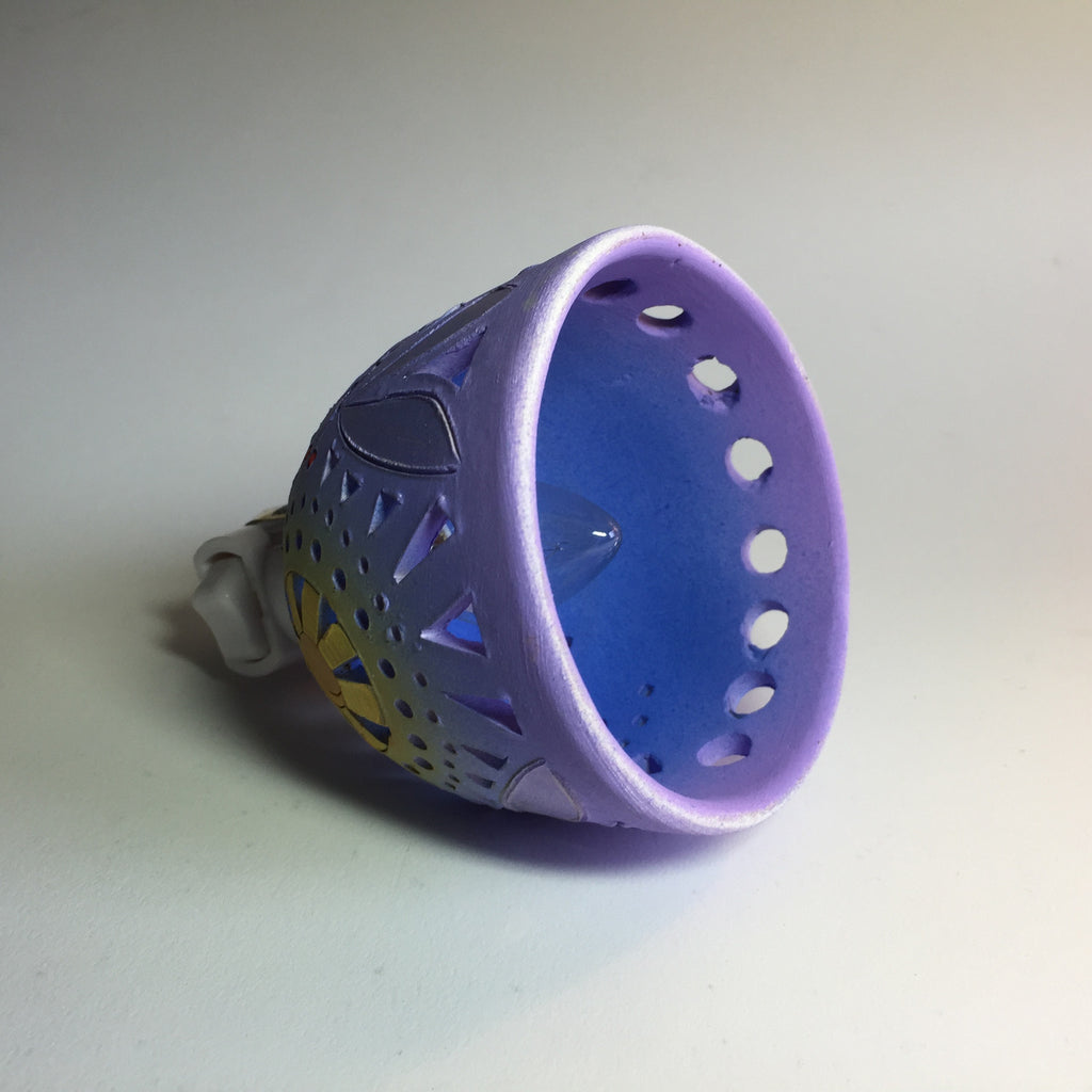 This night light made of white earthenware clay is handmade at starrylights studio. It is hand drawn and carved while the clay is wet, then fired and painted. The exterior is Perriwinkle, and the interior is blue to purple.