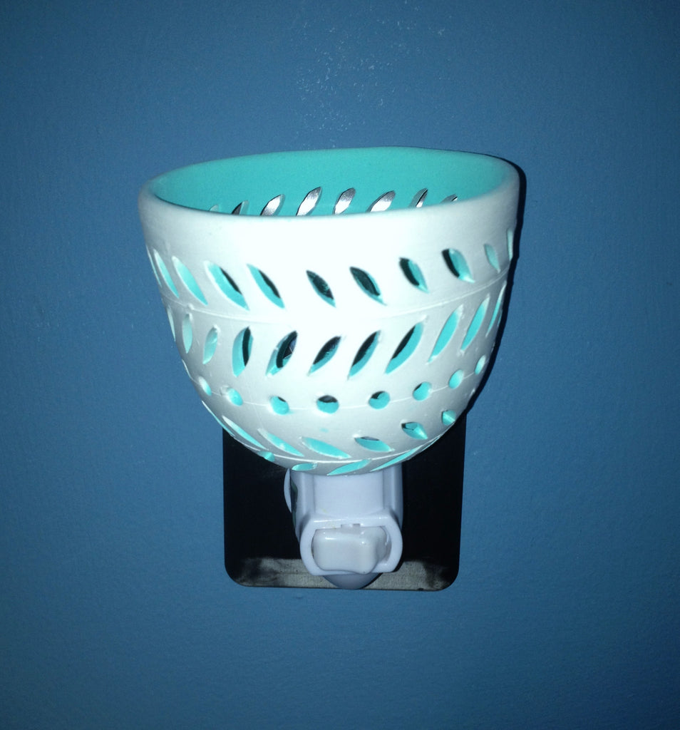 This night light made of white earthenware clay is handmade at starrylights studio. It is hand drawn and carved while the clay is wet, then fired and painted. The exterior is white, and the interior is soft aqua.