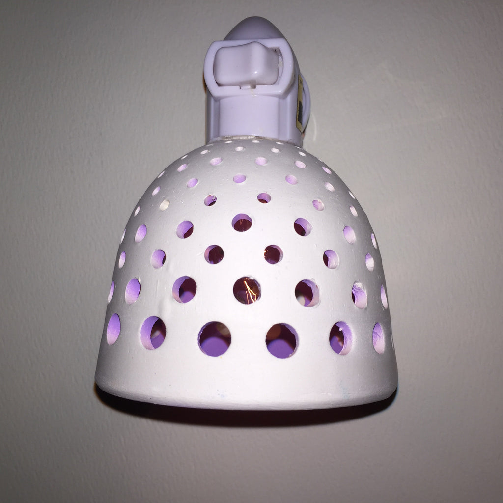This night light, made of white earthenware clay, is handmade at starrylights studio. It is hand drawn and carved while the clay is wet, then fired and painted. The exterior is white, and the interior shades of purple.