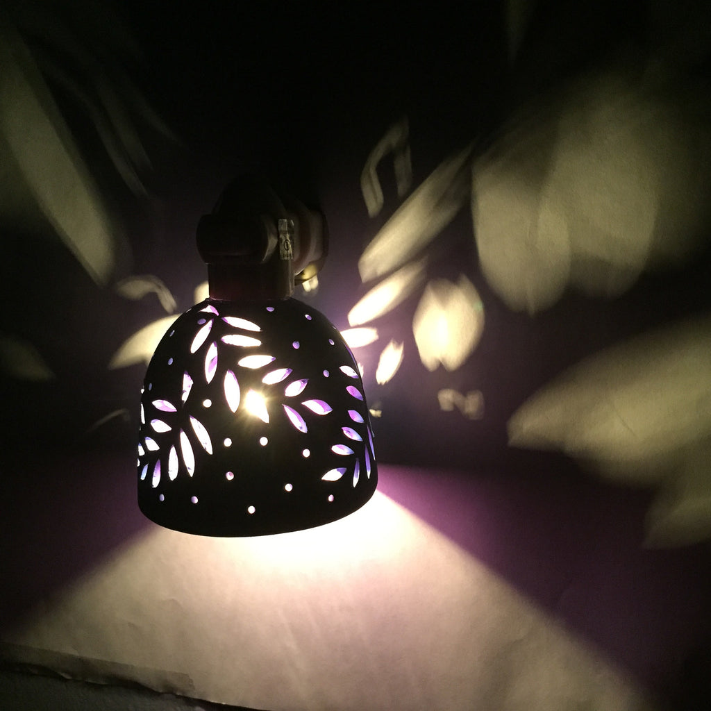 By daylight it blends with room decor, and when lit it casts dramatic light patterns on the wall. It has a rotating plug which holds it away from the wall and allows the light to be pointed up or down, depending on the location of your outlet.