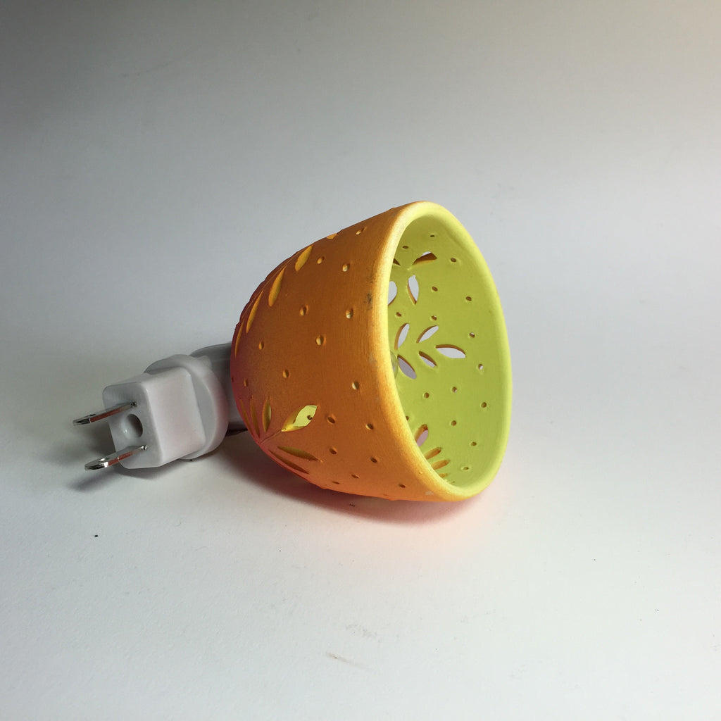 This night light made of white earthenware clay is handmade at starrylights studio. It is hand drawn and carved while the clay is wet, then fired and painted. The exterior is airbrushed in warm tones of coral and orange. The interior is a surprise citrus green.