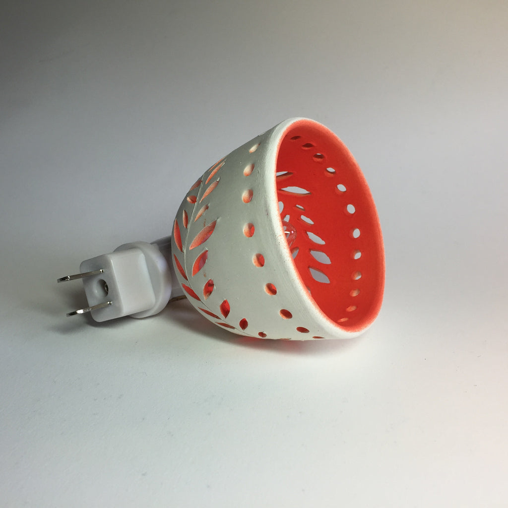 This night light made of white earthenware clay is handmade at starrylights studio. It is hand drawn and carved while the clay is wet, then fired and painted. The exterior is white, and the interior is shaded orange.