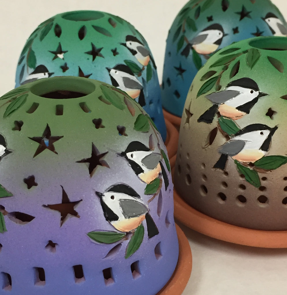 Three chickadees nestled into the branches of a tree. These charming birds are colorful by day and delightful when the candle inside is lit. Light up your patio! These are weather tolerant and the cover protects them from evening breezes. Use a battery tealight as an alternative to fire.