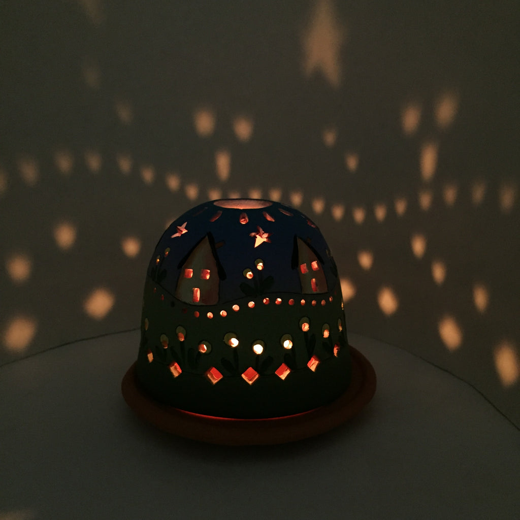 Starrylights are handcrafted ceramic luminaries. Each two piece candle holder is a work of art designed and handmade by the artist, Beth Berggren. A colorful decorative accent by day, the luminaries come alive in the dark. The hole patterns, hand cut into the wet clay as each luminary is created, are not randomly scattered, but are planned and cut to cast enchanting light patterns when the included tealight is lit.
