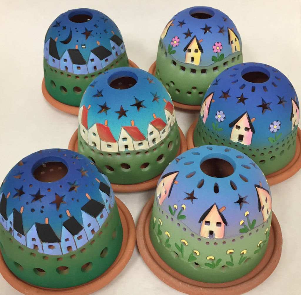 Starrylights are handcrafted ceramic luminaries. Each two piece candle holder is a work of art designed and handmade by the artist, Beth Berggren. A colorful decorative accent by day, the luminaries come alive in the dark. The hole patterns, hand cut into the wet clay as each luminary is created, are not randomly scattered, but are planned and cut to cast enchanting light patterns when the included tealight is lit.