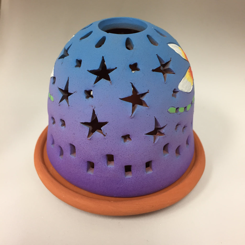 On this luminary two dragonflies hover on each side of the moon. The backside is filled with stars to cast a beautiful lit pattern. Shades from purple to blue. Borders of rectangle shapes.