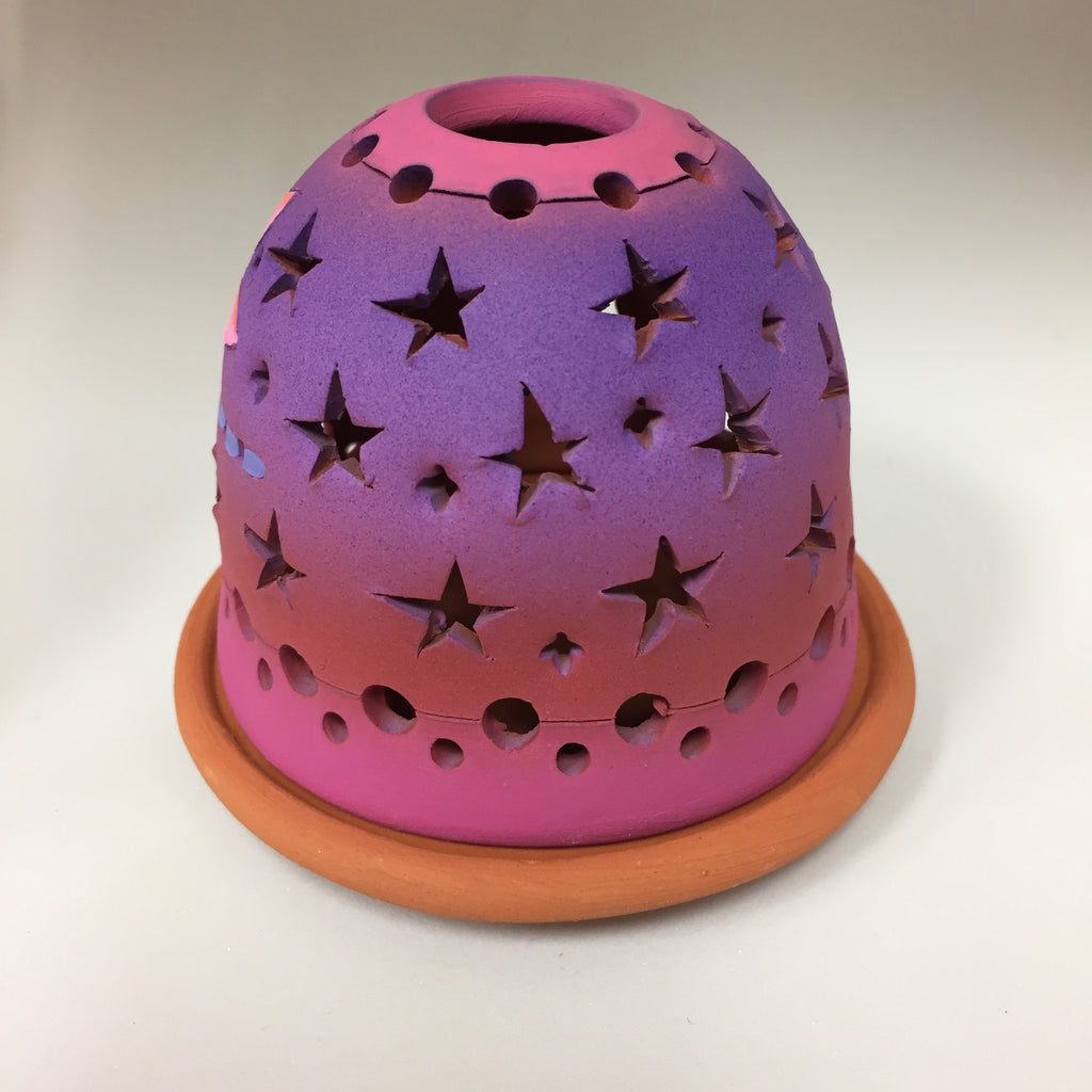 On this luminary two dragonflies hover on each side of the moon. The backside is filled with stars to cast a beautiful lit pattern. Shades from coral to purple. Borders are hot pink with circle shapes.
