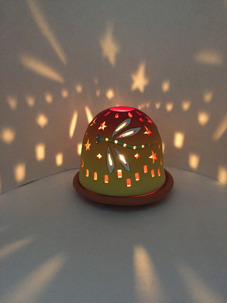 Three dragonflies encircle this luminary. Shaded from yellow to red-orange with star cutouts and pierced dragonfly wing.