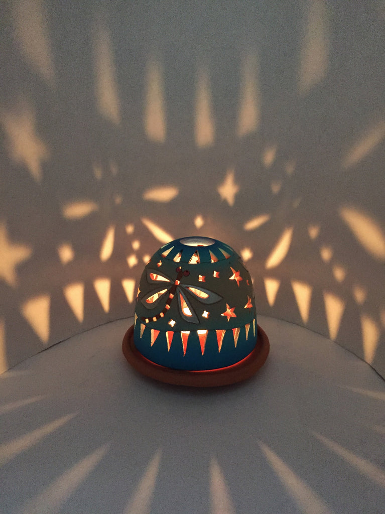 Three iridescent dragonflies encircle this luminary. Beige center band blends to aqua and blue. Star cutouts and pierced dragonfly wings.