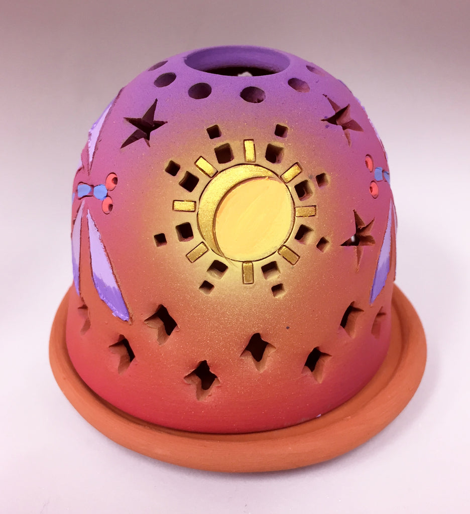 On this luminary two dragonflies hover on each side of the moon. The backside is filled with stars to cast a beautiful lit pattern. Shades from orange to hot pink to purple, Borders of diamond shapes.