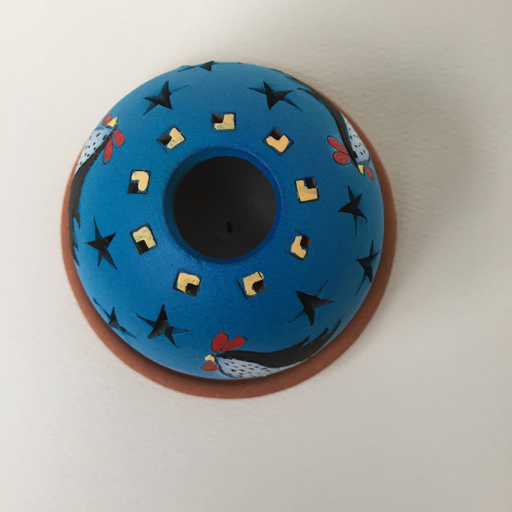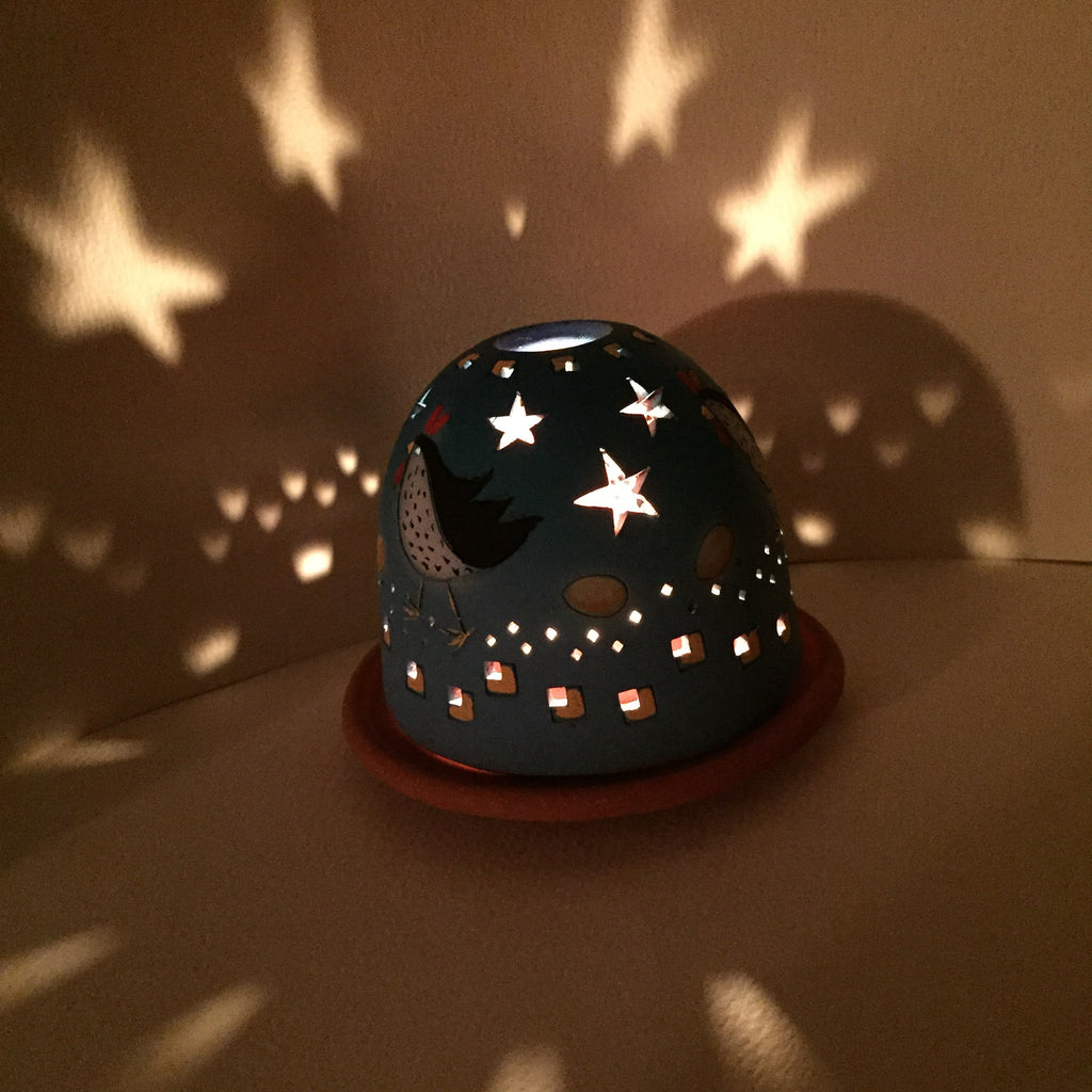 Starrylights are handcrafted ceramic luminaries. Each two piece candle holder is a work of art designed and handmade by the artist, Beth Berggren. A colorful decorative accent by day, the luminaries come alive in the dark. The hole patterns, hand cut into the wet clay as each luminary is created, are not randomly scattered, but are planned and cut to cast enchanting light patterns when the included tealight is lit.
